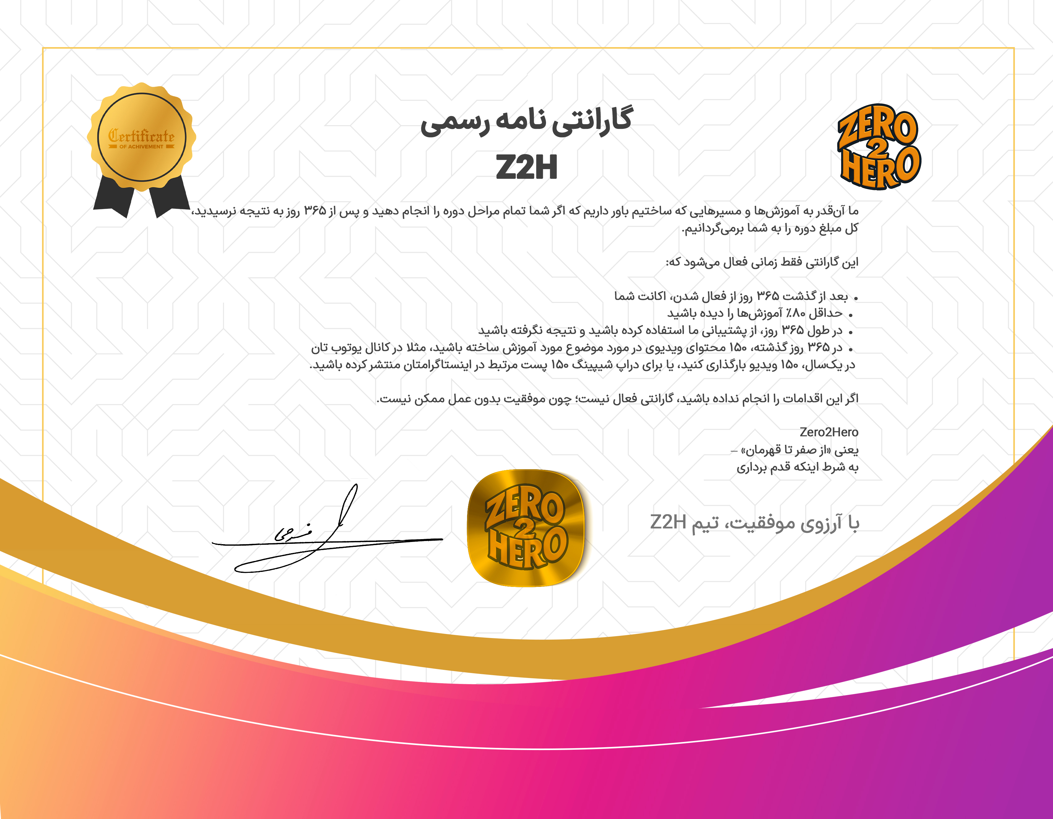گارانتی Z2H ما آنقدر به آموزشها و مسیرهایی که ساختیم باور داریم که اگر شما تمام مراحل دوره را انجام دهید و پس از ۳۶۵ روز به نتیجه نرسیدید، کل مبلغ دوره را به شما برمیگردانیم. این گارانتی فقط زمانی فعال میشود که: • بعد از گذشت ۳۶۵ روز از فعال شدن، اکانت شما • حداقل ۸۰٪ آموزشها را دیده باشید • در طول ۳۶۵ روز، از پشتیبانی ما استفاده کرده باشید و نتیجه نگرفته باشید • در ۳۶۵ روز گذشته، ۱۵۰ محتوای ویدیوی در مورد موضوع مورد آموزش ساخته باشید، مثلا در کانال یوتوب تان در یکسال، ۱۵۰ ویدیو بارگذاری کنید، یا برای دراپ شیپینگ ۱۵۰ پست مرتبط در اینستاگرامتات منتشر کرده باشید. اگر این اقدامات را انجام نداده باشید، گارانتی فعال نیست؛ چون موفقیت بدون عمل ممکن نیست. Zero2Hero یعنی «از صفر تا قهرمان» — به شرط اینکه قدم برداری.